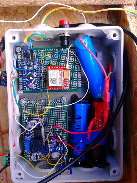 Общий вид конструкции. Видно отдельно плату питания на которой установлены зарядник 1а для одного 18650, преобразоваль dc-dc step up, который выдает 4,1 вольта на выходе и три параллельных акб. Сначала был один, его не хватало. В проекте маячка его хватат для питания конструкции, но она ночью не работает. А здесь передача данных идет круглосуточно. Потом добавился один и в процессе эксплуатации по нышешним грустнопогоднодождливым дням был добавлен третий)). Конечно это плохо, ибо заряжаются они наверняка не ровно, но работают, а это главное)). На второй плате ардуино промини и сам модуль sim800l. Кнопка красная это ресет. Внизу выключатель отключает питание от схемы, но не от акб. И две колодки: солнечные панели и два градусника ds18b20.