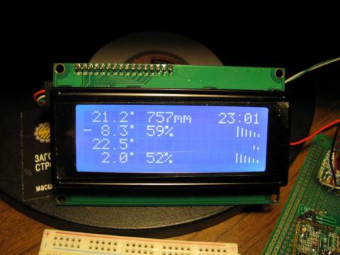 к коду самого приёмника была дописана сама "погодная станция" - вывод на четырёхстрочный дисплей данных с датчиков (температура, влажность, состояние батареи). Также на дисплее в виде т.н."ёлочки" отображается время прихода данных. Чем дольше программа не получает пакет, тем короче "ёлочка". Если данных не было достаточно долго, информация от такого датчика стирается с экрана.