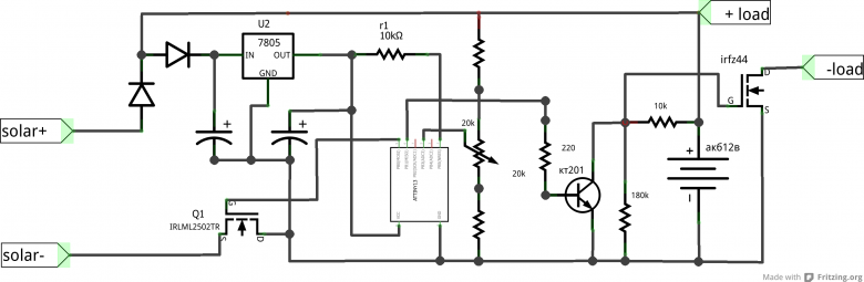 int U = 0; // АЦП 670 - 14.4В, 13.8В - 642 int Pot = 0; // потенциометр для фитч, пока ненужен unsigned char pwm = 0; void setup() { DDRB = 0b00011; // пины 0 и 1 на выход, все остальные на вход } void loop() { U = analogRead(A1); Pot = analogRead(A2); pwm = analogWrite(0); }Итак, вышло солнишко и поигрался немного, вот схема того что собрал: