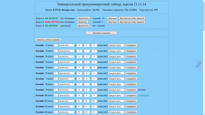 Произвольное (1-100) количество заданий(таймеров), настраивается в веб-интерфейсе.