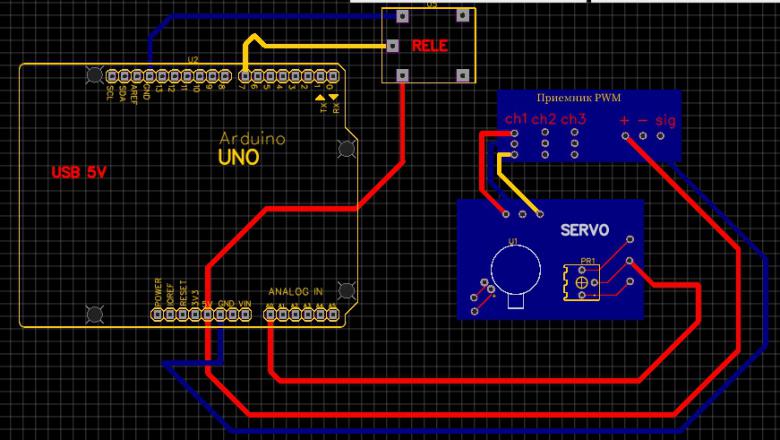 Запускаю схему, все работает откланяю серву на заданный угол - на 7 пин выходит 5в - реле щелкает. Все хорошо.