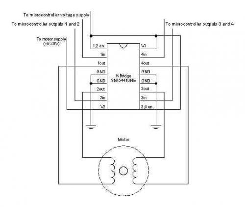 3) Биполярный шаговый двигатель, управление через 2 выхода. Подключение на примере микросхемы L293D.