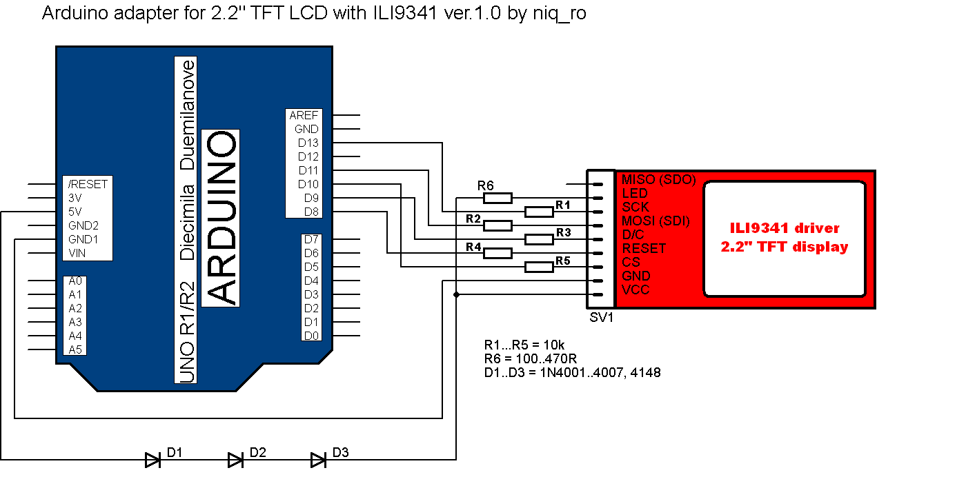 - для скетчей софтового SPI понадобиться либо сделать делители на резисторах как в статье http://arduino-project.net/chasy-na-arduino-tft01-22sp/ . Или для ограничения тока лог. уровней просто последовательно резисторы (проверял 30ком, 10ком - работает, а 100ком, 1ком - не работает) , для этого случая желательно на кондёр около стабилизатора 65Z5 повешать стабилитрон на 3,0-3,3в , потому как эти уровни пересиливают напряжение на стабилизаторе до4-4,5в , от этого дисплей может выйти из строя. //нахрапом , на UTFT у меня тож не завёлся, заработало на https://github.com/adafruit/Adafruit_ILI9341 , ( по сообщению http://forum.arduino.cc/index.php?topic=181679.msg1758347#msg1758347 , можете и всю страницу, тему глянуть)
