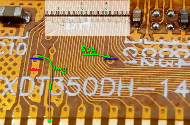 SDA выведена на 1-й pin шлейфа (резисторы R1, R2 отпаяны), IM2 на 40-й pin FPC адаптера.