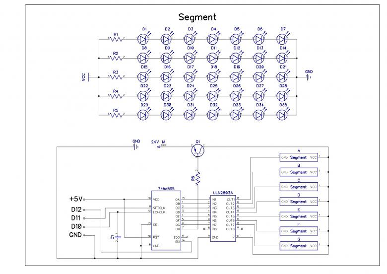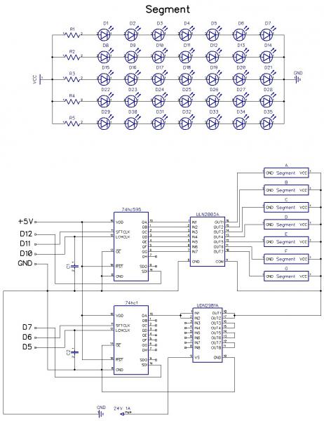 Собственно сама проблема на начальном этапе вот в чем: имеются светодиоды (5мм, 3.2В, 20мА), источник питания на 24В. Светодиоды соединяем последовательно-параллельно, 5 цепочек по 7шт каждая через резистор на 82Ом и таким образом получаем один сегмент дисплея. И если я все правильно понимаю, то для того, чтобы запитать 1 символ потребуется: 3.2 * 7 = 22,4В(у нас 24В) и 20 * 5 = 100мА, в дисплее 4 символа: 100 * 4 = 400мА, значит всем этим делом можно будет управлять через ULN2004 в связке с 74hc595(например) я прав?