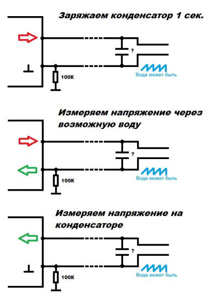 Типа подать напряжение, как-то проверить есть ли ток сразу пока заряжается, после насыщения проверить еще раз, уже не должно быть такого тока, и можно проверять сопротивление, есть вода или нет...