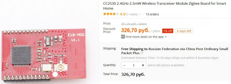 Я не особо против готовых ZigBee решений, т.к. согласен, что там есть много своих плюсов, но нахожу цену в 1000 руб за модуль все-таки высоковатой. С другой стороны, на каких-то конретных моделях свет клином не сошелся и можно попробовать поискать варианты подешевле. Я сейчас бегло прошелся поиском по али и почти сразу нашел CC2530 подешевле: