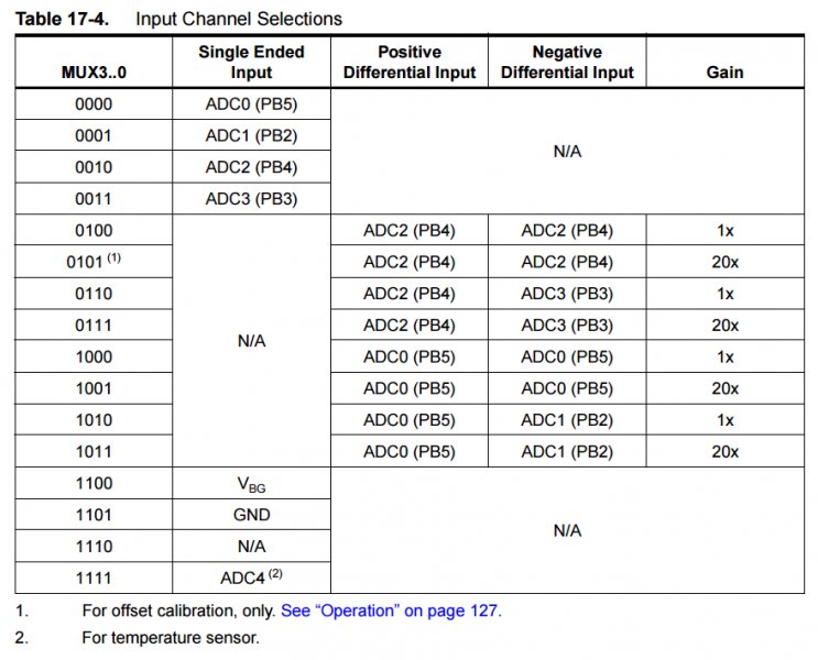 Я так понял, что ставлю регистр MUX таким образом, что положительный и отрицательный дифференциальный вход на один и тот же пин, например ADC0, и тогда у той же ATINY95 можно включить 20x