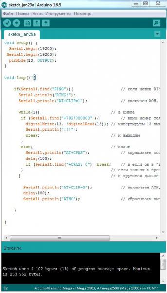 1) Не заливается определенный скетч в мегу. А все другие заливаются. (СМС шлет, звонит на определенный номер по событию)Примеры с этого сайта. Я их немного изменил, программный порт на аппаратный. Кроме этого скетча все работает. Симптомы: в начале rx и tx бодренько начинают перемиговаться,через секунду начинают мигать синхронно раз 2-3 секунду короткими импульсами. Через сек. 30 IDE пишет: