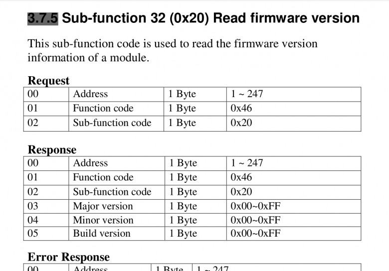//3.7.5 Sub-function 32 (0x20) Read firmware version