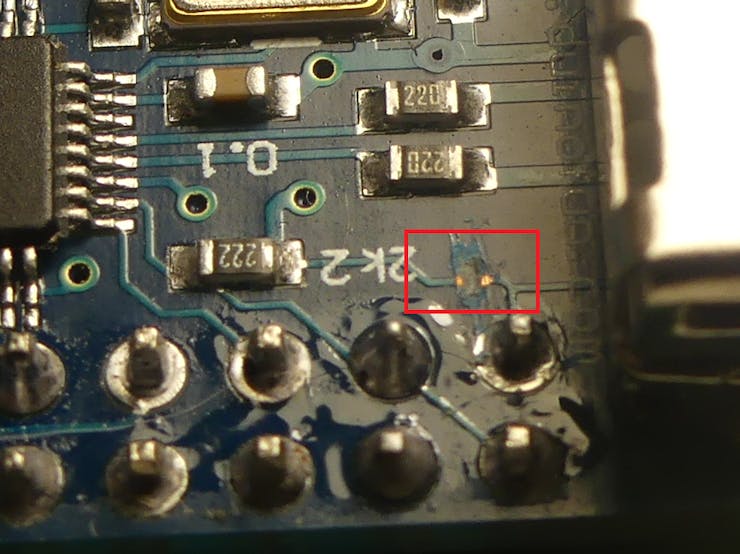 (дорожка между 5В и резистором 2.2кОм перерезана).