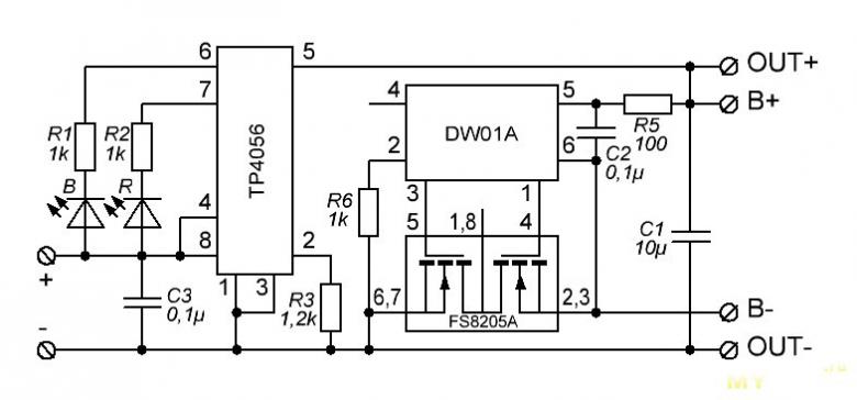 Блин… схема хорошая и правильная, напряжение маловато у нас, особенно когда батарея почти разряжена. Очень сложно настроить полевики на открытие. Есть готовое решение http://mysku.ru/blog/aliexpress/30210.html там полевики уже встроены (ссылка). Если смотреть на схему это Q2 –для заряда он в 4056 внутри и Q3 – он в сборке FS8205 только со стороны минуса батареи. IC1 меняем на DC-DC step up. Т.е. подключаем к OUT модуля. Остается вопрос с током в 1А это очень много, там же в статье есть немного об этом. Между 4056 и DC-DC и на выходе DC-DC необходимо поставить емкости не менее 100мкф (для тока в 1А емкость нужно ставить больше, в компьютерных БП есть 3300 и выше, можно взять там) и не электролитические 0,1 для подавления ВЧ.