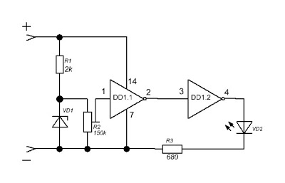 VD1 - стабилитрон , DD1.1 , DD1.2 - два инвертора из шести , которые сидят в одном корпусе микрухи , указанной выше...