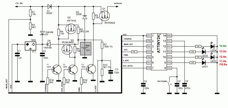 В данной схеме (что я сейчас описал) есть большая проблема – зарядное устройство будет путать режим заряда батареи при включённых потребителях. В схеме выше, что скопировали, там этого нет - D1 и D2 управляют источником на нагрузку (БП или АКБ), а Q1 (Т3, R16) полностью отключают нагрузку от АКБ. При этом зарядка идет через Q2, R5.