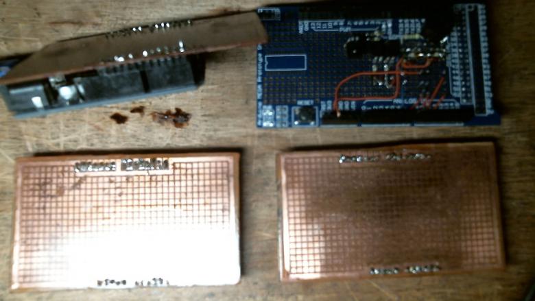 Но иногда нужно сделать плату быстро. Тогда использую текстолит толщиной 0.5мм - делаю дизайн платы "без дырочный". Даже разьемы паяю поверх либо не использую разъемы и паяю прямо на текстолит. Можно сразу на куске протравить десяток таких платок, а после травления (или даже почле лужения сплавом Розе) разрезать на платки обычными канцелярскими нодницами. Такой способ (без дырок, много плат на одном куске, разрезание ножницами) - самый быстрый способ изготовления. Проще уже не куда
