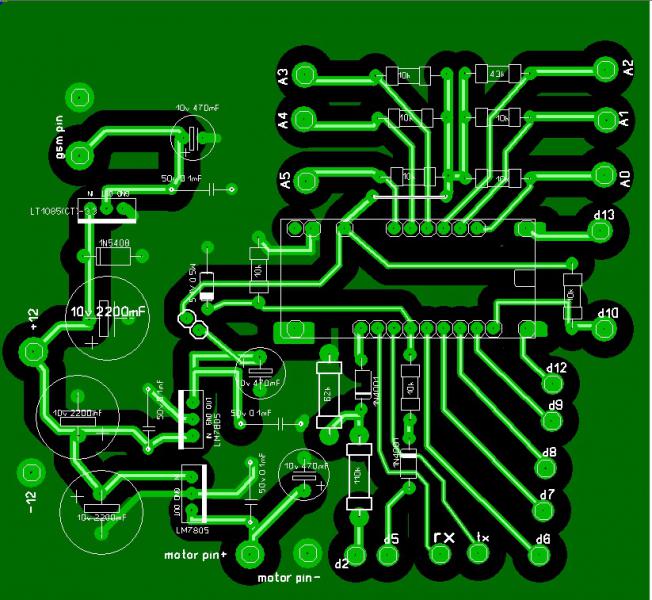 чип грееться, относительно друг друга замкнуты, и земли, остальные работают прекрасно, включаю чип на 1-5 сек, потом греться палец не держит, подключино было 4 реле на выходы d6-d9, реле уже с обвязкой на малый ток, т.е. на реле питание, земля, и вход. и был gsm модуль подключен на пины 3,4. на макетной не собирал, собрал сразу на печатной. т.к. все протестировал в программе proteus. питание брал 12 вольт от дешевого БП, фото выкладывал раньше(фото БП), сегодня приду домой скину фотки.