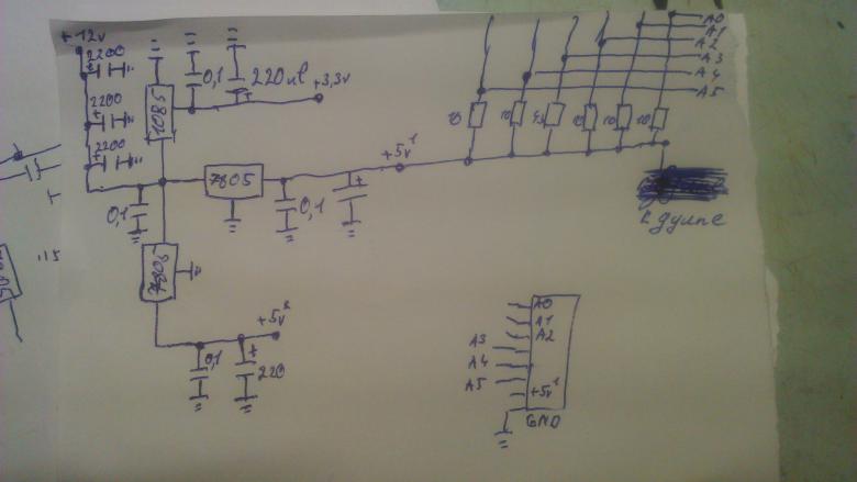 полная схема только вместо UNO у меня NANO. входа и выхода те же. питание для дуины, беру с нижнего стабилизатора. земля везде общаяя