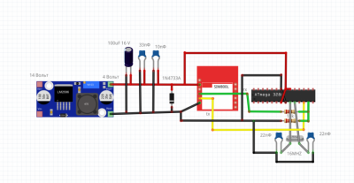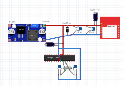 Еще электролит желательно подключать непосредственно возле выводов питания жрущего модуля (SIM800). А провода питания контроллера подключать непосредственно к выходам преобразователя напряжения. И тогда еще один электролит непосредственно возле выводов питания контроллера. А керамику цеплять и там, и там вместе с электролитами.