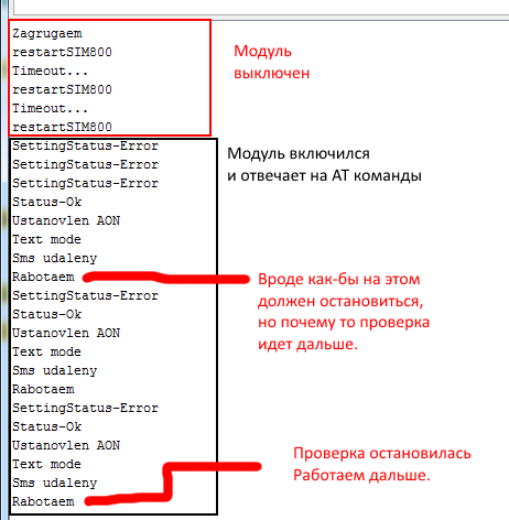 Чтобы это проверить, я подаю питание на ардуино (SIM800 выключен), жду когда модуль не ответит несколько раз и включаю питание SIM800