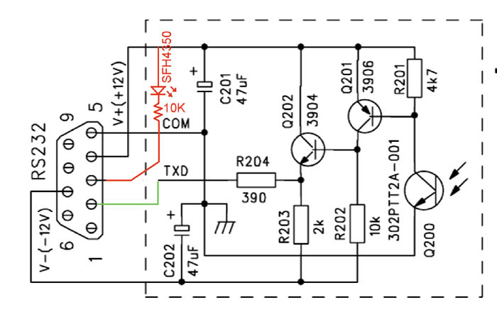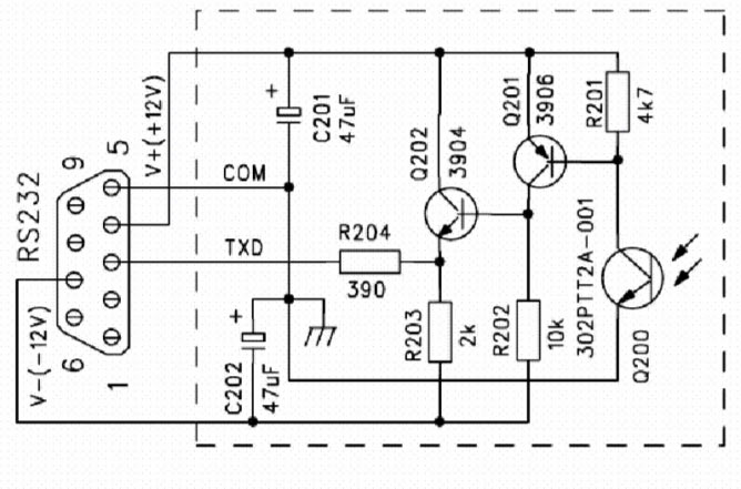 Нет никакой ошибки. Для индикации добавили светодиод, не более (он там не очень-то и нужен). Я бы попробовал поставить светодиод последовательно с R202 - по модуляции свечения (возможно) можно будет видеть, что данные передаются. Вывод 3 на разъёме СОМ есть выход (TxD) и изначально там (по стандарту) минус 12 В.