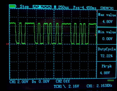 Посмотрел, что передает мультиметр! Пачки импульсов идут примерно каждые полсекунды! Если растянуть сигнал во времени - видно даже отдельные биты!
