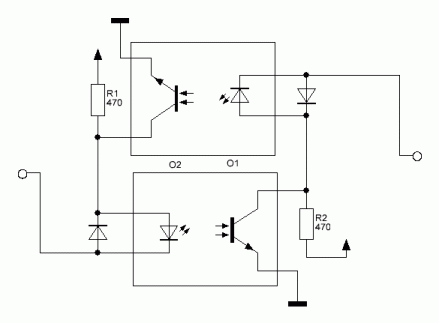 Внимательно рассмотрел схему - она мне нравиться. Теоретически работает. Параллельная пара "светодиод- диод" как раз и есть звено развязывающее направление передачи. Да и проблем с логическими уровнями я не вижу. А между "стрелкой" ,т.е. " +5 В" и выводом обозначенным кружочком таки поставить 4,7 кОм для уверенной логической единицы.