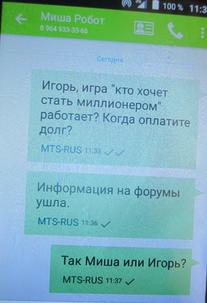 Товарищ Миша, кстати, из Новороссийска, и увлекается робототехникой. Всё же не исключаю, что это Игорь :) Если я ошибся - Миша поправит, и пост со скрином с СМС можно будет потереть, ничего страшного. Пока же вижу (опираясь ещё на одного исполнителя), что есть что-то похожее в действиях.