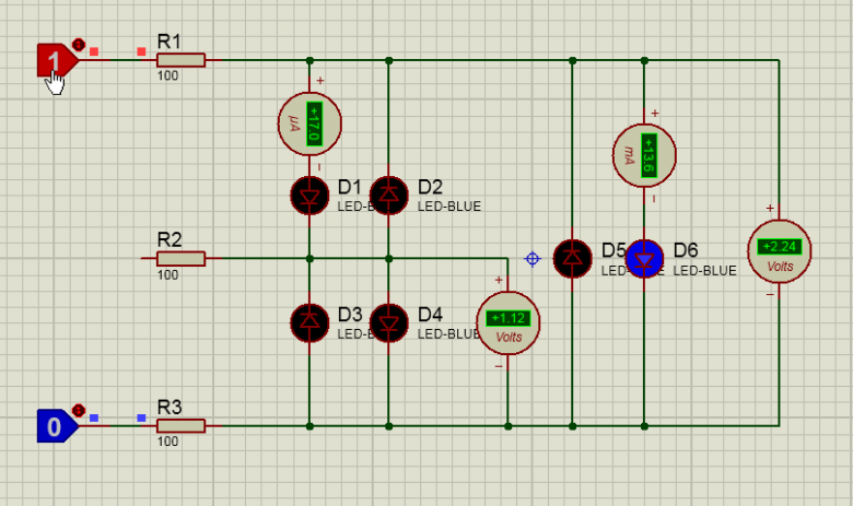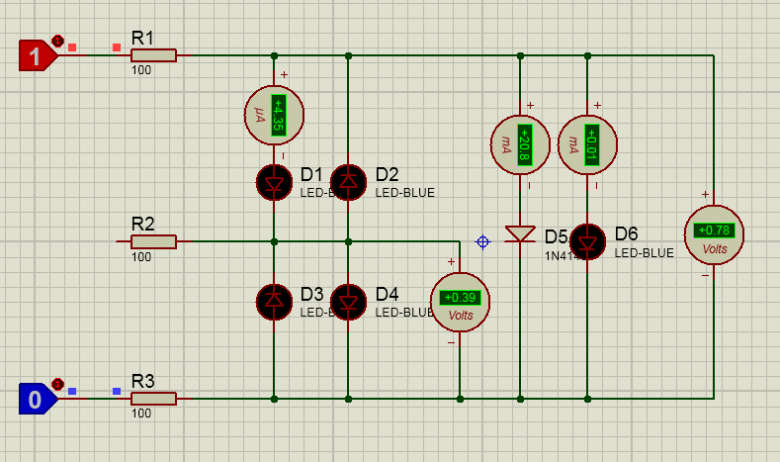 Пусть для определенности резисторы по 1 кОм, питание 5 Вольт, а падение напряжения на диодах 2 Вольта.