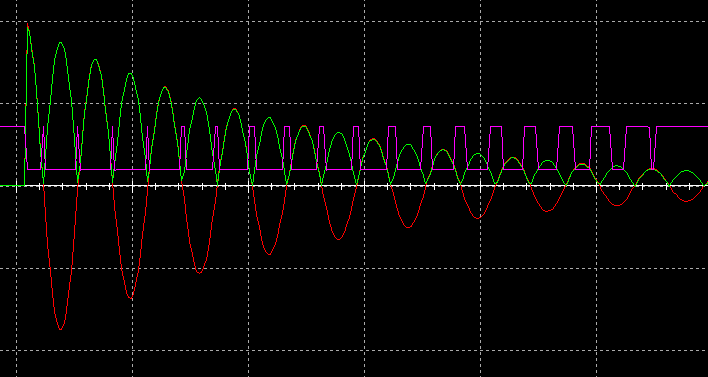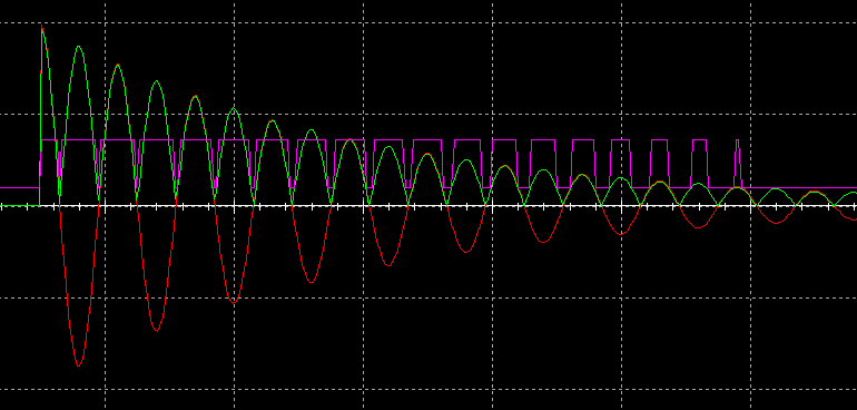 Сигнал на компаратор идёт в виде затухающей синусоиды, ввиду этого, компаратор срабатывает с изменяющейся частотой, и в какой-то момент он сработает последний раз, необходимо зафиксировать время до наступления этого момента