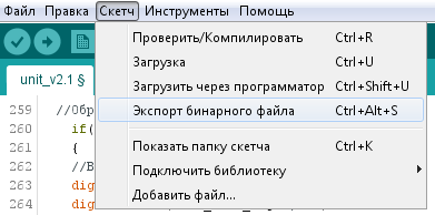 Результат такой, в Arduino IDE компилируется прошивка через меню «Скетч/Экспорт бинарного файла».