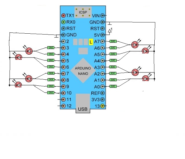 Почти так, только светодиодов оставить по 3 штуки иначе превышаем общий ток ардуины, он 200ма