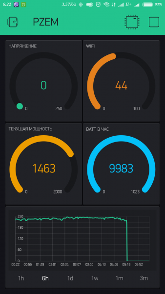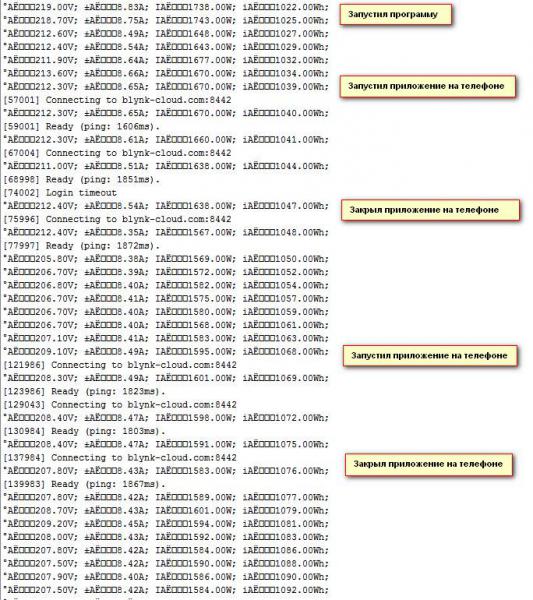 Согласно скетча, каждые 5 сек. в мониторе порта наблюдаю показания, полученные с PZEM-004, так же привязываю их к вирт. пинам. И все хорошо и стабильно работает пока не запущу на телефоне приложение.