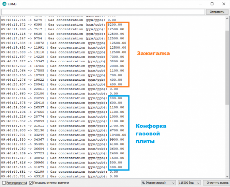 Однако, модуль выдает значение метрики вовсе не в %LEL, а в единицах PPM (Parts Per Million). Для пересчёта необходимо знать, что объёмная доля метана в атмосфере, равная 5% и 100%LEL, соответствует 50000 PPM. Путем несложных математических вычислений находится максимальное значение метрики, эквивалентной 25%LEL и объёмной доле метана - 1.25%, равное 12500 PPM.