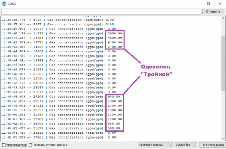 Селективность датчика неплохая. Он, хоть и отреагировал на TVOC в виде одеколона "Тройной", но только играя роль пробки флакона. Просто находясь рядом с горлышком ничего не чует. Газ из зажигалки детектирует. На тыканье в открытую на 1 сек конфорку газовой плиты - тоже реагирует. В обычных условиях выдаёт 0 PPM.