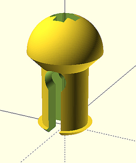 $fn=150; union() { difference() { union() { difference(){ //Рисуем сферу и перемещаем translate(v = [0, 0, 17]) { sphere(8); } //Рисуем цилиндр и перемещаем translate(v = [0, 0, 13]) { cylinder(8, 8, 8, true); } }//Конец translate(v=[0,0,14]){ cylinder(h=3, r=5, r2=8);} cylinder(14,5,5); cylinder(1,5,6); } //Из полученного вычитаем //Паз штырька translate(v=[0,0,5]){ cube([3,8,14], center=true);} //Паз сжима translate(v=[0,0,5]){ cube([12,3,14], center=true);} //Выборка крестика translate(v = [0, 0, 24]) { cube([6,2.5,10], center=true); } //Выборка крестика translate(v = [0, 0, 24]) { rotate(a=90, v = [0,0,1]){ cube([6,2.5,10], center=true); } } //Выборка цилиндра сжима translate(v=[-10,0,12]){ rotate(a=90, v=[0,1,0]){ cylinder (20,2.5,2.5); } } } translate(v = [0, 0, -0.5]) { cylinder(1, 15, 10, true); } }А вот сама деталька (ее высота 24мм)