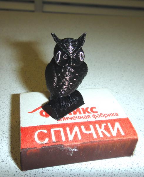 Не хотел флудить, но не удержался. От делать нечего напечатал статую филина (модель нашел в интернете). В слайсере уменьшил в четыре раза размер модели, обработал и отправил на печать. Результат меня поразил. На фигурке высотой 30 мм видно каждое перышко, глаза и зрачки, с торца полешки видны радиальные трещинки древисины..... Все получилось просто идеально. Ни какой обработки не требуется. Жаль блики на фото не могут передать как моделька выглядит в реале.... В реале выглядит безупречно.