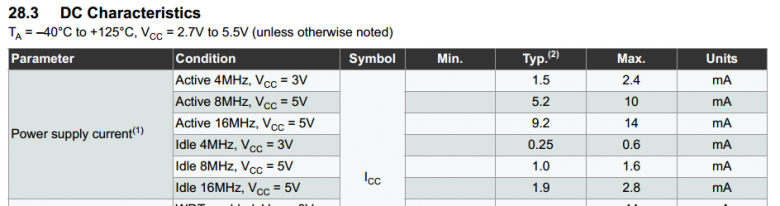 Скажу честно, сам не замерял. Но в даташите на 328p сказано, что при 16Мгц/5В -9мА , а при 4Мгц уже 1.5мА (в шесть раз!) Учесть, конечно порт, но если полевиком управлять, то тоже потребление невысокое.