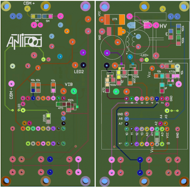 Развел со всеми плюшками ( вибра, фонарь, бузер, светодиод), ардуино лежит на плате под дисплеем. Гантелька 10мм , резистор 100М от принтера, керамика в накачке 100мкф, фильтр ВВ 0.1мкф 450в ( в холостую без последствий до 800 заряжался) , в остальном смд . Лепил из того что было.