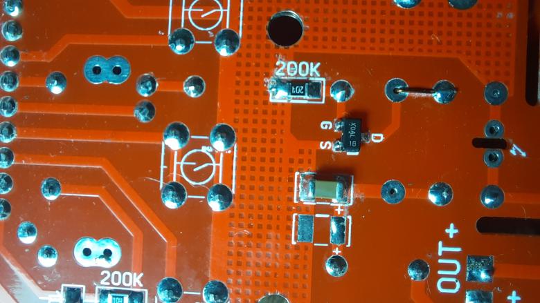Транзистор стоит ao3400. Как минимум нужно добавить один-два керамических конденсатора по 10 микрофарад возле полевика накачки, на плате место под два, стоит один. И повторить настройку длины импульса.