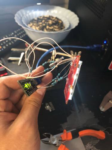 Наконец собрал всё в кучу. Плату использовал от alexadresat, под старую arduino pro mini. Частично изменил плату под габариты своих деталей. Катушку мотал "яйцеботом" на 8мм гантельке, виток-к-витку проводом ~0.1мм от катушки кварцевых часов. Через каждые 50 витков пролачивал лаком PLASTIK-71, через 200 - каптоновый скотч. В плате под каждым smd-компонентом, около высоковольтной части, просверлил отверстия, чтобы легче было вымывать. Мегаомные резисторы 1%. Мыл несколько раз: зубная щетка+вода+мыло, затем в пакете-струна растворителем "Этилацетат". Так несколько раз, с продувкой и просушкой. Потом закатал в plastik-71, несколько слоёв с промежуточной сушкой. С разъёмом под пины дисплея что-то затупил - часть контактов не хотела лудиться. В итоге, на нервах, пытаясь выпаять этот разъём, добился отгорания дорожек, но потом запаял по нормальному. В который раз убеждаюсь - надо предварительно залуживать и пины, и разъёмы, если они без позолоты. Также пожалел, что покрыл плату лаком до того, как запаял ардуину с дисплеем. Обгоревший лак смотрится не красиво, как не смытая канифоль.