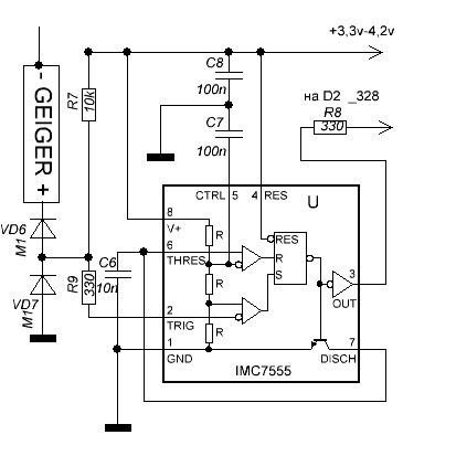 вот формирователь импульсов со счётчика гейгера работает исключительно хорошо и нету ложных срабатываний как в схеме ардоса ,сама трубка работает как антенна ,теперь можно эту схему использовать для ардоса с новой прошивкой