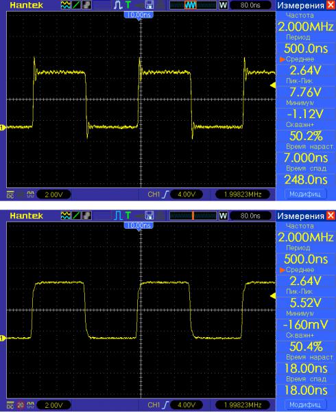 Вот как выглядят осциллограмки 2 мегагерца. Верхняя с выключенным фильтром, вторая со включенным.