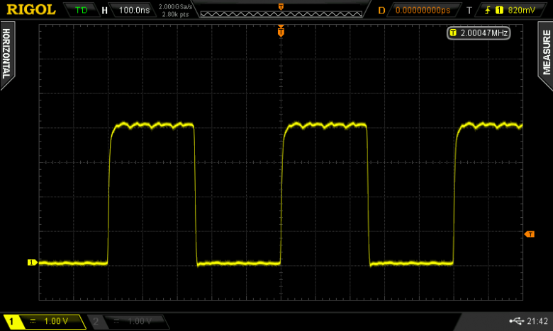Сигнал вполне себе стабильный, его форма не носит случайного характера. И прошу обратить внимание, что одна клеточка на экране составляет 20 наносекунд. Это ни какая-нибудь частота 50 герц. И задействовано всего 4 килобайта памяти осцилографа (правда у него ее всего 40 килобайт).