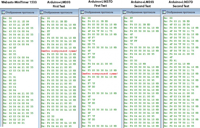 Сегодня послушал протокол с помощью VAG COM KKL 409. На картинке первый столбец - это запуск и остановка котла от минитаймера 1533. Загрузил скетч #478 в обе Arduino. При первой попытке с LM393 котел запустился и работал (хоть и проскочило сообщение "Ошибка контрольной суммы". Кстати, что это?). На последующих тестах котел запускался и тух (переставал качать насос). Где-то раньше, где-то позже.