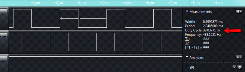 #include <TimerOne.h> int brightness = 0; // how bright the LED is int fadeAmount = 5; // how many points to fade the LED by byte level=0; volatile byte pwm_cnt=0; void setup() { // declare pin 9 to be an output: pinMode(9, OUTPUT); Timer1.initialize(10); Timer1.attachInterrupt(timer_action); } void loop() { // analogWrite(9, brightness); level=brightness; brightness = brightness + fadeAmount; if (brightness == 0 || brightness == 255) { fadeAmount = -fadeAmount ; } delay(30); } void timer_action(){ // digitalWrite(9, pwm_cnt<level); bitWrite(PORTB,1,pwm_cnt<level); // D9, PB1 pwm_cnt++; }>а анализатор подключать - меня все-таки обломало
