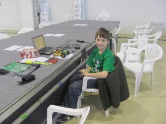 Тренировка. Зона была оформлена очень неплохо: 3 ряда столов для участников и между рядами расположены поля для тренировок. Поля размещены на полу, чтобы не ловить роботов. Очень практично. Жаль только что от этих полей до тех мест, где можно было расположиться слишком далеко, поля на полу и закрываются соревновательной зоной, толпящимися детишками и .. ничего не видно, от слова "почти совсем". Попытка снять кино его первой тренировки оказалась "почти бесполезной" добрую половину пути робота не видно вовсе. Ладно, ходим кругами, курим, сидим .. в общем "ждем-с".