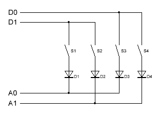 Диоды - развязывающие ! Без них мона считать тока 4 комбинации нажатых кнопок ( с неоднозначьностью ), а с ними - 16 комбинаций - все возможные одновременные нажатия от 1 до 4 кнопок сразу.....