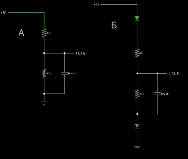 bodriy2014, замучался я бороться с последствиями разгона. Спаял делитель с диодами по варианту Б, нулевая линия подскочила на 0,5в. Сам делитель выдавал четкие 1.1, правда номеналы резиторов были у меня 27k и 4,7k. Возможно, опять же, внутренние связи помешали нормально работать схеме с таким преобразователем питания и делителями. Хоть и делитель выдавал нужный вольтаж, но в системе падала стабильность, иногда (даже при 1.1 AREF) развертка не работала, прибор уходил в перезагрузку (при питании от сети через БП и стабилизаторы такой проблемы не наблюдалось). В общем, угробил несколько дней на борьбу с последствиями разгона и принял решение, что откажусь от него. Для меня, лучше меделеней, но стабильней, чем быстрей, но с бубном и плясками.