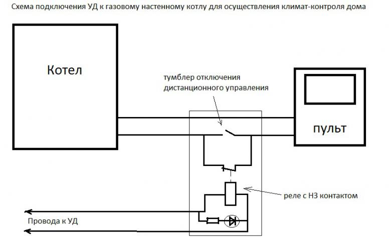 Есть только один минус у этого способа! Когда пульт обесточен, а котел в режиме ожидания, то котел не реагирует на начавшийся расход воды ГВС. Т.е. если кто-то включил горячую воду в душевой кабине ( а у меня котел греет горячую воду только для душевой кабины), то котел не запускается, вода бежит холодная. Для этого я предусмотрел в схеме тумблер, который стоит параллельно НЗ контакту реле и замыкает цепь связи пульта. Замкнув этот тумблер, схема возвращается в свой заводской вид, что важно на случай неадекватной работы УД.