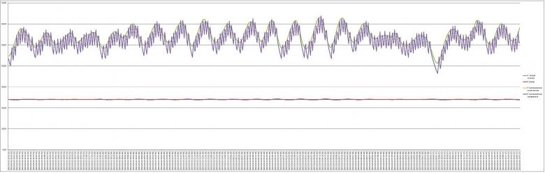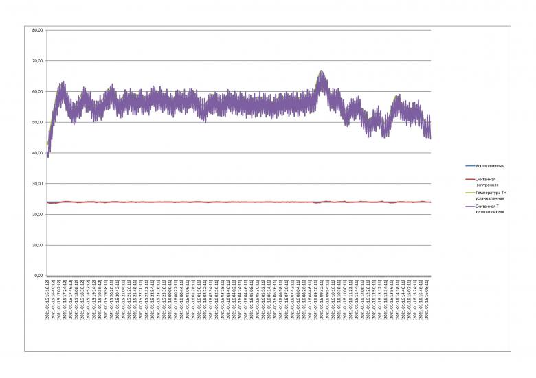 Сутки оказались показательными - с 16:00 до полуночи температура снизилась зде-то на 7 градусов, утром начался ветер, днем супруга готовила. Это отражается на поведении термостата. Сначала небольшое увеличение температуры теплоносителя, потом еще увеличение, во время готовки - снижение.